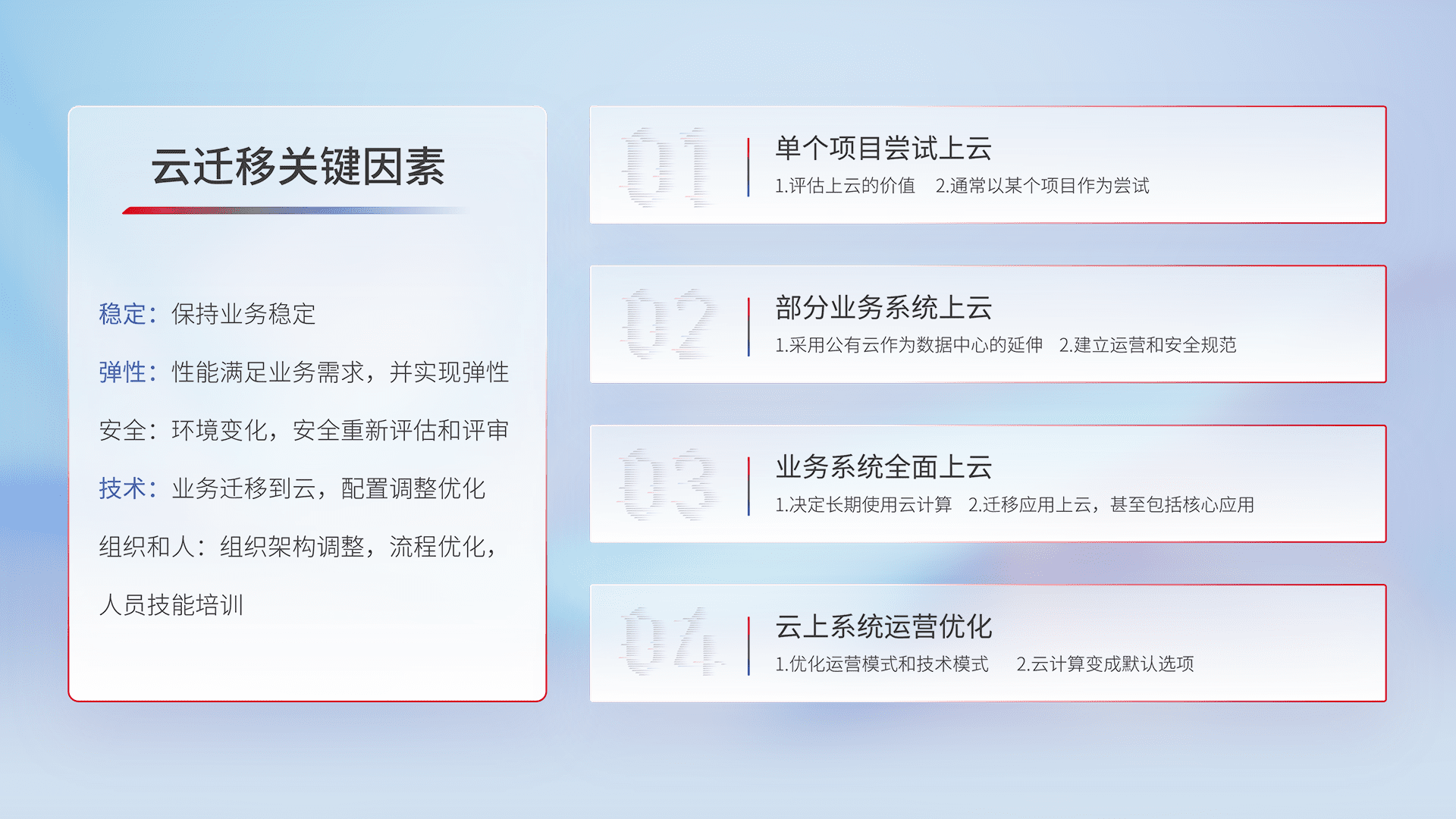 结合实际业务,,从规划设计、、云平台选型、、、云原生改造、、、、数据迁移、、集成交付,,,迁移全过程为客户识别最佳上云路径,,,,做好风险识别管理,,设计网络架构、、、、身份权限、、、、安全审计合规、、、操作审计、、日志审计、、监控告警策略、、多站点容灾设计等,,对云上基础设施进行整体规划,,提升IT治理水平,,,,以满足弹性、、、高可用、、高性能的需求。。