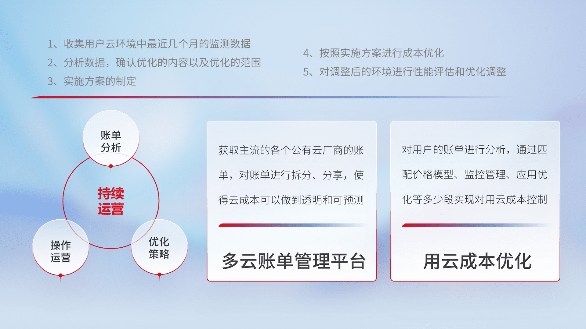 通过多云纳管,,,,以统一的资源数据模型把客户的云资源进行抽象和封装,,,进而实现对多云资源的统一操作,,,,保障云资源管理的可靠性、、、、稳定性与可用性。。。量身定制化运维内容,,,配置、、、开发运维、、、、补丁管理、、备份、、监控、、、认证和访问管理、、、审计和日常巡检等,,,,保障在用云过程中的可靠度,,,稳定度以及高可用率。。