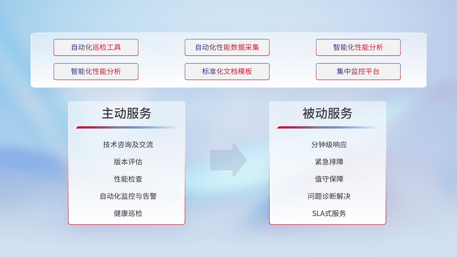 智能化工具和标准化文档,,,保障服务质量,,,,提供主动服务(包含技术咨询、、版本评估、、、性能检查、、自动化监控与告警、、、健康巡检)和被动服务包含(分钟级响应、、紧急排障、、值守保障、、问题诊断解决、、SLA服务)。。。。